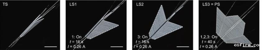 4D打印是纤维增强复合材料3D打印的前沿研究方向,其在传统3D打印基础上增加了时间维度,通过引入形状记忆材料、智能水凝胶等功能材料,实现3D打印构件的形状、性能和功能能够在外界预定的刺激(热能、水、光、pH值等)下随时间发生变化。目前,碳纤维4D打印技术已取得一些研究成果。如南方科技大学WANG等提出了一种连续纤维增强复合材料4D打印折纸的精确部署控制策略,通过结构设计巧妙地利用连续碳纤维高强度、能导电、传热好的特性,实现了承载能力强、状态可重构、时空可调控、形性可调制的电热折纸。该电热折纸在航空航天领域具有广泛的应用潜力,如可变形机翼、空间可展开结构等(图 2)。西安交通大学WANG等提出了一种基于连续纤维增强液晶弹性体的直写4D打印方法。该方法结合了液晶弹性体的可逆热致伸缩变形能力和连续纤维材料的优异力学性能,制备了具有承载能力以及变形能力的复合材料桁架结构,为创建软机器人、机械超材料和人造肌肉开辟了新途径。