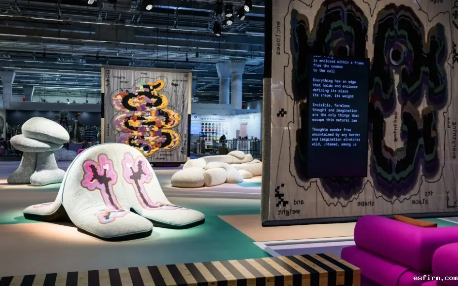明星建筑设计师Patricia Urquiola在12.0展厅展示了其设计装置“among - us”。该装置由Patricia携手Kettal、Moroso、cc - tapis、Aquafil和Cimento等品牌共同打造,展示了专为Heimtextil定制的作品,为零售业与酒店业展现出未来纺织设计的无限潜力。受绘图软件启发,“among - us”装置的地面被特意设计成网格形状,图纸上的虚拟世界跃然浮现在现实世界。装置中心是抽象与有机形态的纺织元素,例如沙发形态的雕塑,体现了材料与技术的相互作用。此外,该装置还展示了纺织创新对设计流程的影响、传统手工艺与空间和产品设计的融合。