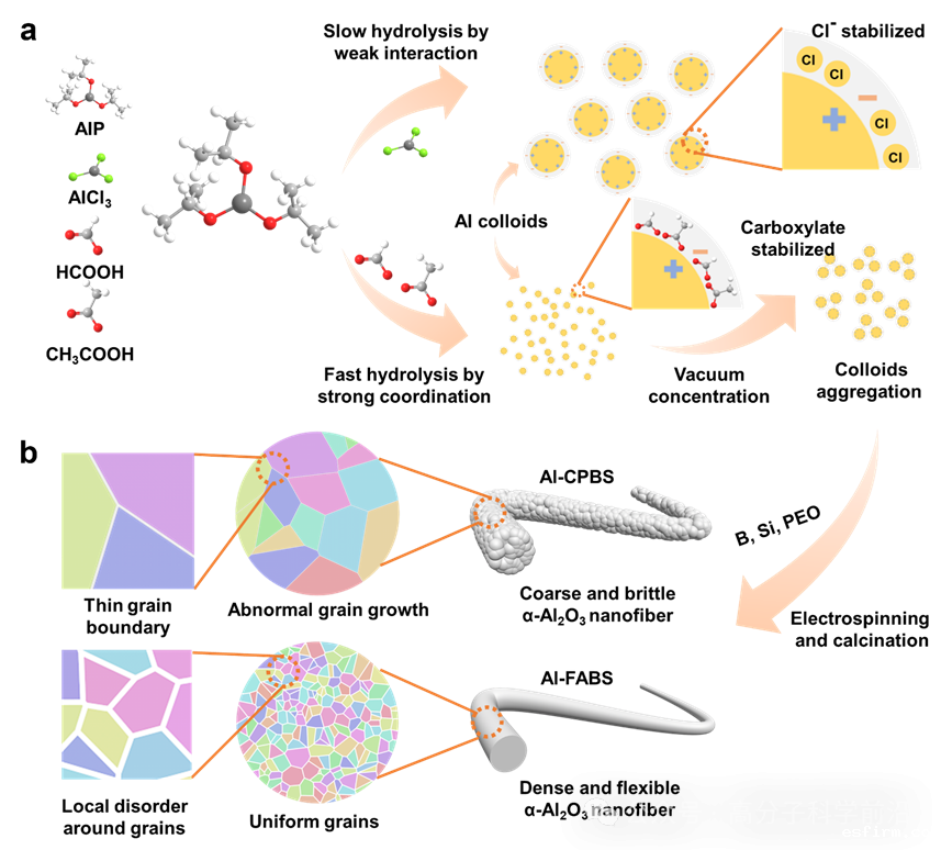 研究团队通过将羧酸体系与无机氯化铝水解铝前驱体两种体系制备铝溶胶进行对比,突出了羧酸根的配位作用对获得小粒径铝溶胶的重要性,而对应的氯化铝体系中的氯离子在水解缩聚过程中缺乏对铝溶胶的有效限制作用,导致胶粒尺寸以及水解缩聚产物分布的不均匀性增加。随后将铝溶胶与聚合物模版混合,通过静电纺丝以及热处理后得到晶粒细小且致密的α-Al2O3纳米纤维,纤维内晶粒间弥散分布的局部无序层可有效耗散外部应力,赋予其优异的力学性能,而相对应的氯化铝体系纤维微观结构粗糙,内部异常生长的大晶粒与遍布纤维的孔洞严重破坏了纤维的完整性,导致最终的纤维呈现脆性。