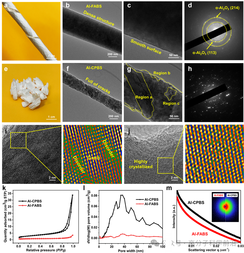 纳米材料的力学性能与微观结构密不可分。羧酸铝体系制备的α-Al2O3纳米纤维在HR-TEM下具有均匀的纤维结构且表面致密光滑,宏观展示的陶瓷纤维膜具有优异的柔性,可轻易的缠绕在玻璃棒上而没有结构破坏;相比之下氯化铝体系的纤维内部存在大量的孔隙与异常生长的晶粒,破坏了纤维的完整性,由此制备的陶瓷纤维集合体力学性能较差。逆傅里叶变换直观地展现出羧酸铝纤维中晶粒间包围的局部无序区,而氯化铝体系中均为高度结晶,规则排布的原子阵列。通过氮气吸附脱附测试得到的比表面积,孔尺寸分布与小角衍射也证明了羧酸铝体系纤维的表面结构致密与内部结构均一性。