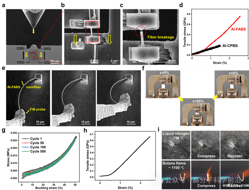 力学性能是判断羧酸铝策略在α-Al2O3纳米纤维强化中的重要指标。利用高精度原位纳米力学测量系统收集受力过程中纤维的应力-应变反馈信息,最终的羧酸铝体系纳米纤维的力学性能达到了0.76 GPa,超过对比样品氯化铝体系纤维三倍以上,同时展现出单纤维良好的柔性,并且即使在500次疲劳屈曲测试以后,纤维集合体仍然保持着良好的柔性。为了应对多种极端环境下的使用场景,将纳米纤维材料置于-196 ℃的液氮环境以及1100 ℃的高温场景中测试,结果表明即使在宽温度区间内,纤维集合体仍然具备优异的柔性。