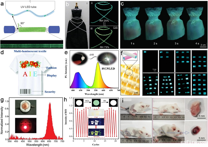 柔性、轻便、多色发光的纤维在智能纺织品和显示领域的应用潜力引起了很多研究者的兴趣。例如,DING等将柔性AIEgen通过连续干湿纺丝法制成的荧光纳米纤维表现出优异的机械性能,可以编织成功能性织物,用于展示、时尚和防伪(图1d)等领域。静电纺丝纳米纤维具有优异的柔韧性和良好的可剪裁性,将制备的白发光CPL活性纳米纤维薄膜封装在商业UV芯片上时,呈现出明亮的白色发射(图1e),展示了其在构建高色纯度、高稳定性、高性价比的CPL柔性薄膜上的潜力,为CPL器件的规模化生产提供了可行性。