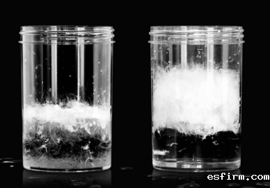 普通羽绒与拒水羽绒遇水后状态对比