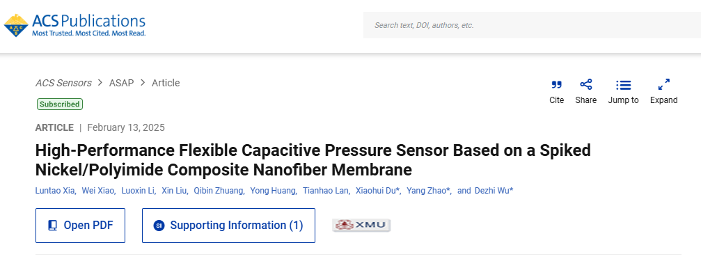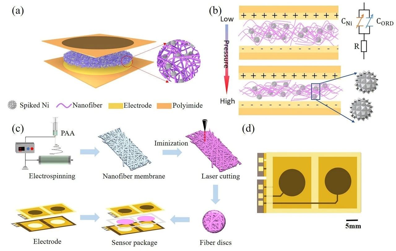 近日,厦门大学吴德志教授团队设计研发了一种基于金属颗粒与聚合物的复合纳米纤维膜的电容式柔性压力传感器,能够在1.5 MPa的宽压力范围内稳定工作。该项工作采用静电自组装的方法将尖刺Ni颗粒吸附进多孔的聚酰亚胺纳米纤维膜内部,以此构建尖刺Ni/PI复合纳米纤维膜介电层,相较于纯聚酰亚胺纳米纤维膜,其传感器灵敏度提升了4倍以上。同时配备了小尺寸可拓展式的电容式阵列传感器及其采集系统。经测试,传感器表现出超过1000次循环的长期稳定性和快速的响应/恢复时间(30/40 ms)。其卓越的性能表明该传感器可应用于人体运动检测、睡姿监测和足底压力测量等多种场景,在可穿戴系统中具有良好的应用前景。该项工作以“High-performance flexible capacitive pressure sensor based on a spiked nickel/polyimide composite nanofiber membrane”为题,发表在期刊《ACS Sensors》上。