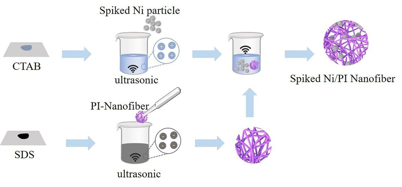将尖刺Ni颗粒和PI纳米纤维膜分别放入CTAB溶液和SDS溶液中,随后将PI纳米纤维膜放入CTAB溶液,通过阴离子和阳离子的吸附,观察到尖刺Ni颗粒吸附在纳米纤维膜之间,得到尖刺Ni/PI复合纳米纤维膜。