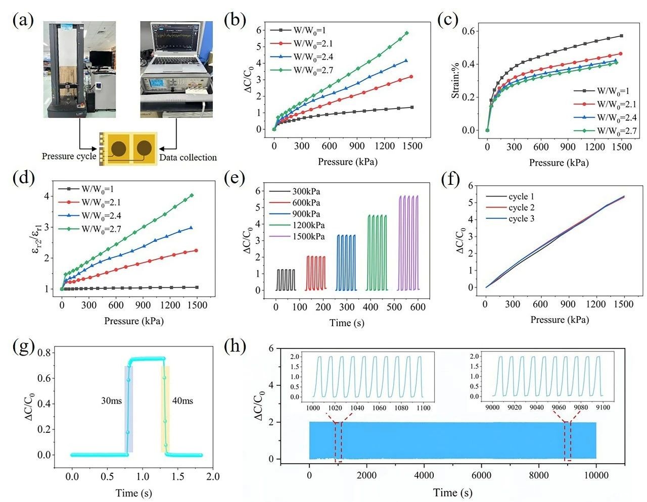 当前,柔性压力传感器在健康监测、人机交互、智能假肢及电子皮肤等前沿领域不断实现技术突破。在物联网、大数据、人工智能等新兴技术推动下,其应用深度持续拓展,特别是在复杂工业场景中展现出独特优势。但当前仍存在一些挑战:当传感器处于高压环境下,其内部介质材料的压缩模量急剧增加,致使器件灵敏度快速衰减,严重制约了其应用进程。在此背景下,研发兼具大量程、高灵敏度和快速响应/恢复的新型柔性压力传感器,已成为重要研究方向。