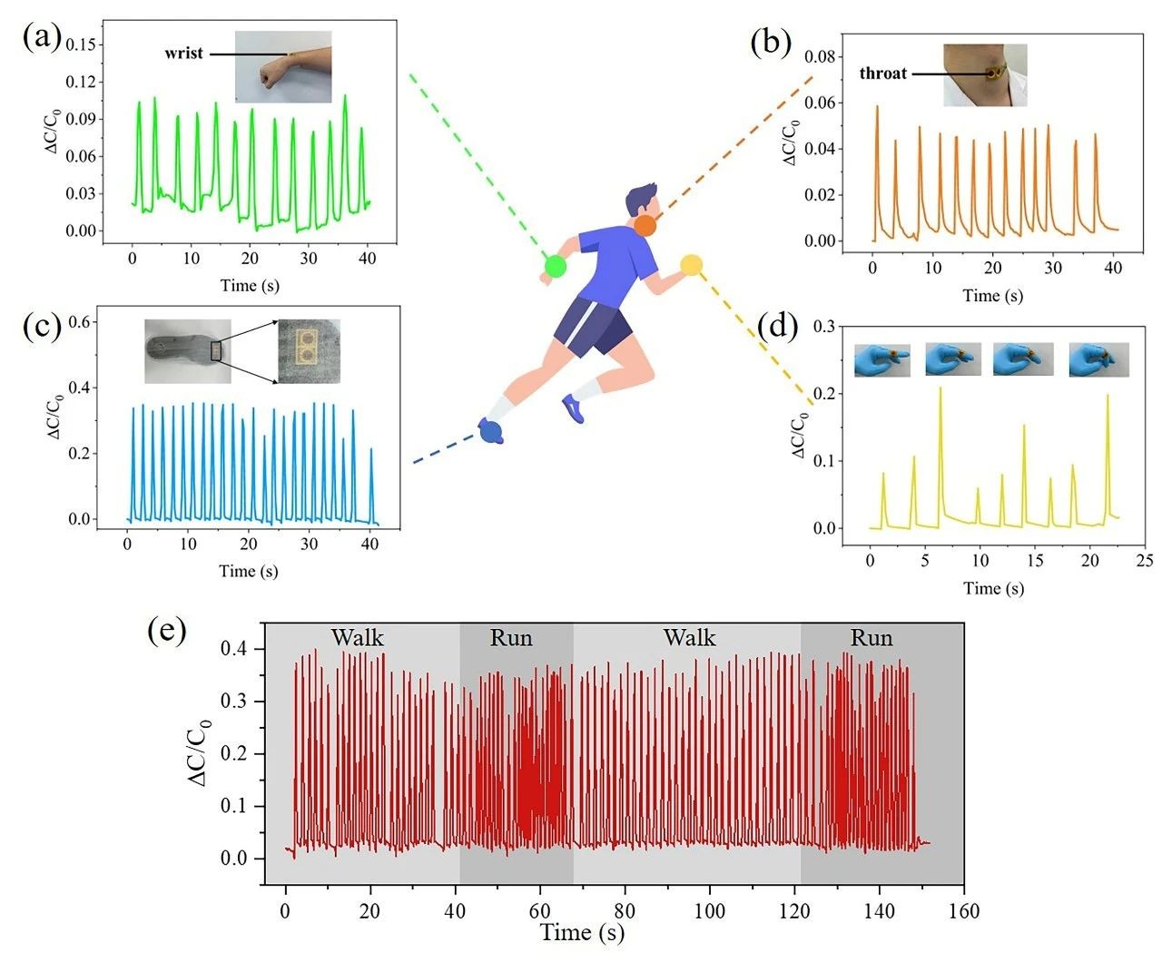 实验结果表明,采用该方法制备的传感器具有良好的传感性能,快速响应/恢复时间30/40 ms、压力检测范围~1.5 MPa,500 kPa下重复1000次循环机械稳定性良好。此外,通过设计可扩展的传感器阵列,可针对各种压力监测应用进行定制,例如人体运动检测、睡姿监测和足底压力监测。