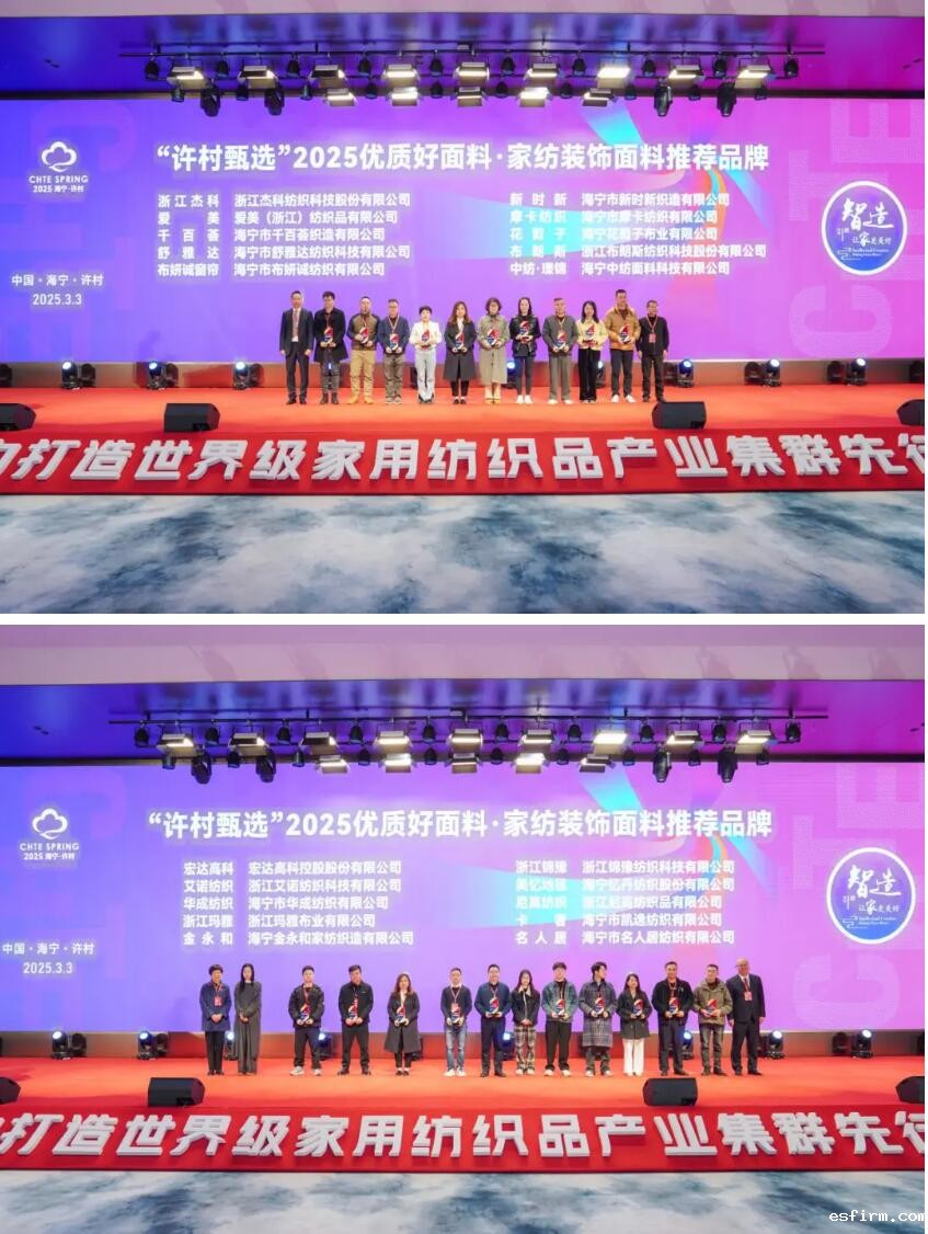 开幕式现场,周红霞、许新峰、曹毅、周强海为宏达高科、艾诺纺织、爱美等20家“许村甄选”2025优质好面料·家纺装饰面料推荐品牌授牌。