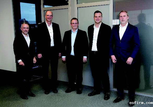 欧瑞康化学纤维事业板块首席技术官Jochen Adler(左一),首席执行官Georg Stausberg(左二),战略与业务发展主管Lukas Adamek(右二)与赢创高管