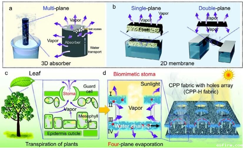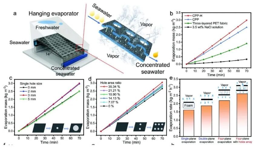随后,将CPP-H织物斜挂在高海水槽和低空槽之间,组装成向光斜挂蒸发器。高水槽的海水会渗透织物边缘,沿着斜挂织物的底层和顶层流动,实现了从高海水槽向低空槽的海水传输。阳光照射下,织物吸收太阳光并将其转化为热,促使海水在顶层的上表面(平面I)、顶层的下表面(平面II)、底层的上表面(平面III)和底层的下表面(平面IV)四个平面同步蒸发(图1d, 图3)。其中,外平面(I和IV)的蒸汽可直接扩散至大气中,而内平面(II和III)的蒸汽则沿中间层传输,并通过顶层孔阵列扩散至外部环境。CPP-H织物的蒸发模式模拟了植物叶片的蒸腾过程。蒸发后剩余的海水被浓缩为盐水,并滴落至低空收集槽,从而有效避免蒸发器内部盐结晶积累。实验结果表明,该三层光热织物在1.0 kW /m2光照下蒸发速率可达2.6 kg/ m2 /h,性能优于基于类似材料的传统漂浮模型(单平面蒸发,1.6 kg /m2/h)、单层织物悬挂模型(双平面蒸发,1.9 kg/ m2/h)或三层织物(四平面蒸发无蒸汽通道,2.2 kg /m2 /h)(图3)。
