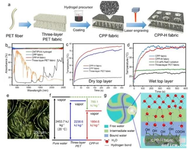 实验结果显示,CPP-H织物的太阳光吸收率显著提升至96.1%,展现出低热损失和优异的光热转换性能(图2),为高效太阳能海水蒸发提供了理想的光热平台。此外,织物表面富含极性官能团,可通过氢键和静电相互作用调控表面水分子状态,从而显著降低水分子“逃逸”所需能量,进一步降低蒸发焓和提升蒸发效率。