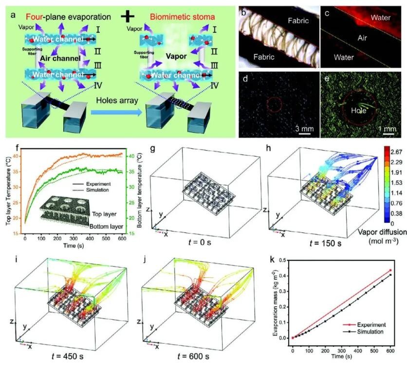 研究团队模拟了CPP-H织物中蒸汽的生成及其通过顶层孔阵列扩散的过程(图4)。为直观展现孔阵列的增量效应,蒸汽扩散路径被可视化,并通过颜色深浅映射蒸汽浓度分布。结果显示,平面II和III的有效蒸发作用使中间层的蒸汽摩尔浓度迅速上升,随后蒸汽通过顶层孔阵列自发扩散至蒸汽浓度较低的外部环境。