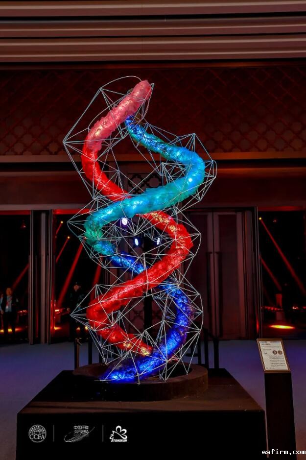 图 | 在本次发布会入场处,由李薇与法国艺术家洛朗-莱特里携手打造学术性与先锋性并重的艺术装置引人注目。两位艺术家以纤维为源头,将质尚与致远化为两条巨蛇,一为烈焰,一为流水,盘旋交缠,倒映远古DNA双链。其以桐昆原液着色纤维为脉络、再生三维中空短纤为血肉、涤纶长丝网纱为肌肤,将桐昆的高新科技与当代先锋艺术美融合。作品通过LED光影与金属管网构建能量流动的视觉奇观,隐喻科技与自然的和谐共生。