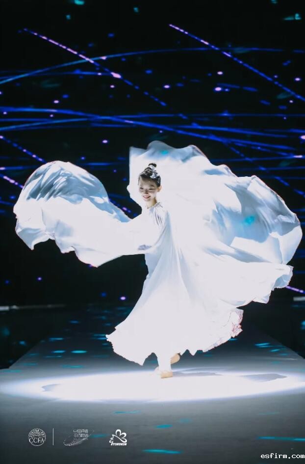 在闪耀的舞台上,舞蹈艺术家身穿宛如火焰般炽烈的飘逸纤维舞服,翩跹而至,每一个动作散发出惊心动魄的美,像是被赋予生命的精灵在空间内展现自己的华裳,快速旋转下搅动起的纤维面料旋涡,展现着洋溢和热烈,面料的起落像是翱翔的华羽,亦是破浪的闪耀鳞片,衣摆在翻飞中簇拥着舞蹈艺术家的身体,观众被这番天人合一的纤维之舞深深吸引。