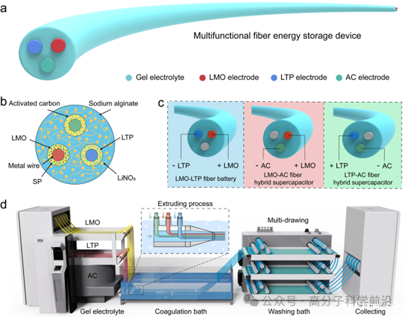 相较于传统的两电极纤维储能器件,包含LMO-LTP-AC三电极的设计结构能够扩展纤维储能器件的功能性,其中任意两电极连接均可以构成一种纤维储能器件。通过涂覆—挤出方法将负载活性材料的纤维电极与海藻酸钠凝胶电解质结合,实现其高速连续化制备。