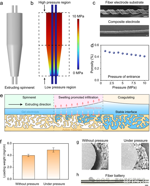 设计具有双压力区的挤出模具,分别在高压区实现对纤维电极的压实以提高活性材料的负载量,在低压区促进电解质的浸润以实现良好的电极/电解质界面接触。利用高分子电解质的挤出胀大效应,进一步提高界面稳定性。