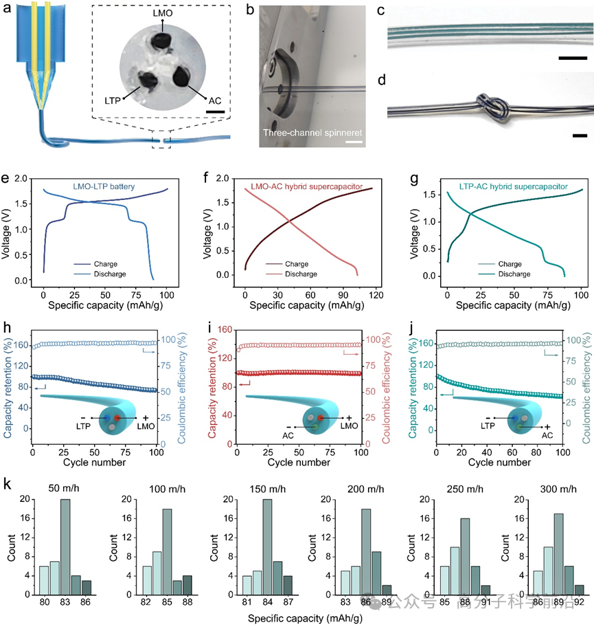 多功能纤维储能器件同时具有纤维锂离子电池和纤维混合超级电容器的功能,并在三种工作模式下均展现出良好的充放电性能:在纤维锂离子电池功能(LMO-LTP)下,其初始比放电容量达到89.4 mAh/g;而在纤维混合超级电容器功能下,LMO-AC和LTP-AC组合分别实现了102.8 mAh/g和83.2 mAh/g的放电容量,并实现了100圈的稳定性循环和95%以上的库伦效率。通过设计八单元喷丝板,该方法实现了最高2400 m/h的制备速度。