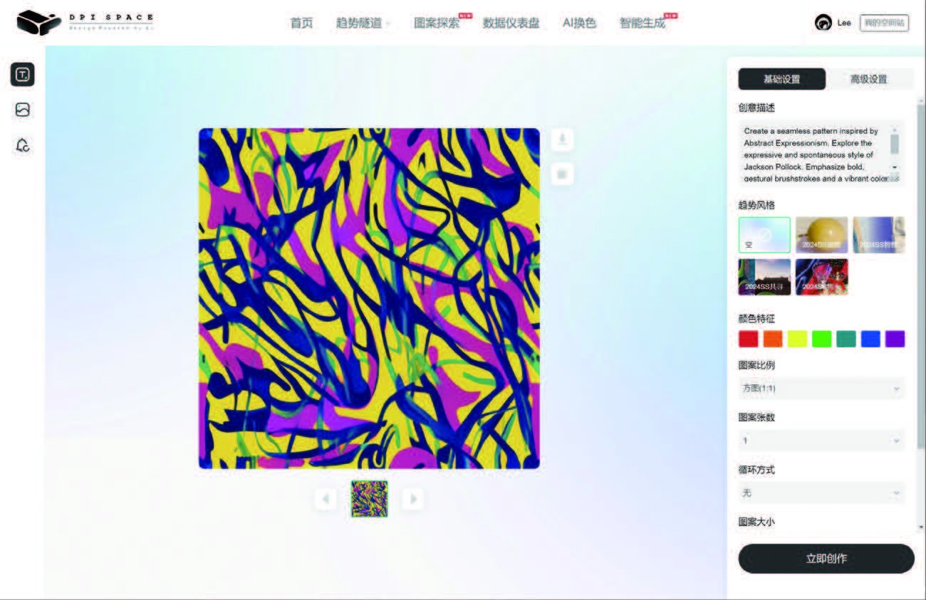最后,创新研发基于人工智能与大数据技术的纺织品图案设计平台。团队自主研发了3个产业化应用系统:“DPI SPACE纺织品图案创意设计平台”提供了流行趋势研究成果、系列化人工智能生成图案及数据分析工具;“鲁丰D2B印花图案创意设计交互平台”创建了关联设计、生产、营销及品牌客户的产品开发全流程图案设计协同交互平台;“桑罗D2C家用纺织品图案创意设计应用程序”创新开发了消费者参与设计的D2C新模式。