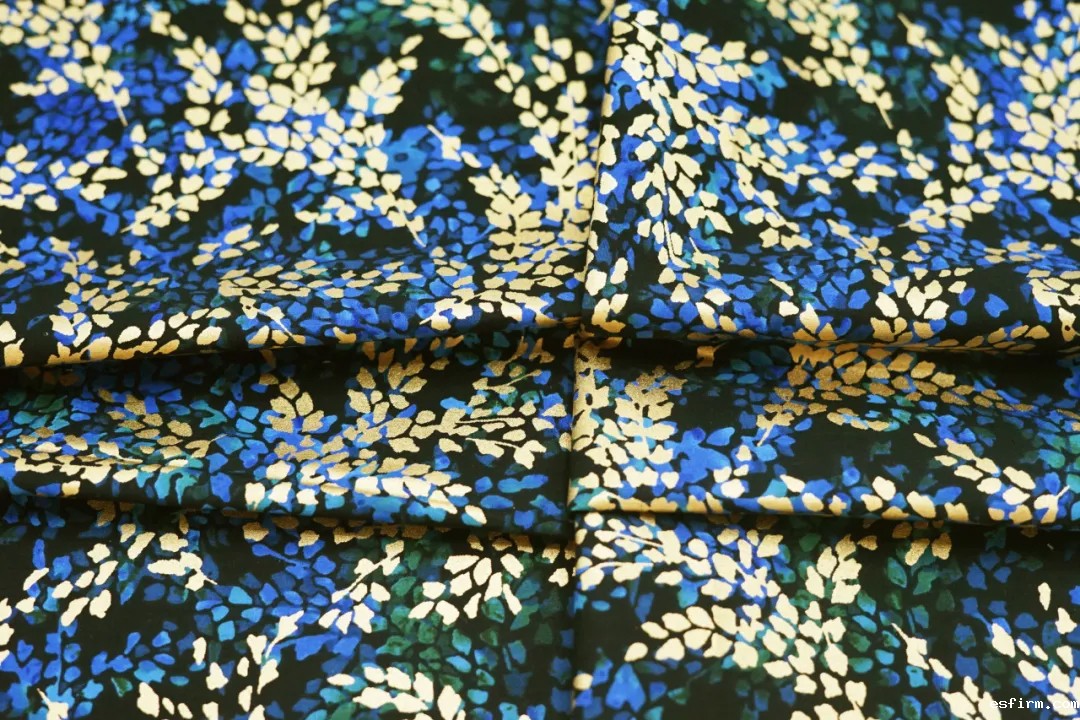 点评:采用100%优质棉,结合40S高密平纹组织赋予面料细腻挺括、干爽透气的品质感;花型设计运用AIGC(人工智能生成技术),融合非洲蜡染布图案风格,形成层次多变的繁茂枝叶花纹,金粉工艺的叠加,将自然风格与高贵气质融合,展现自然与浪漫的花镜美学、既实用又富有文化特色,适用于休闲装与礼服等。