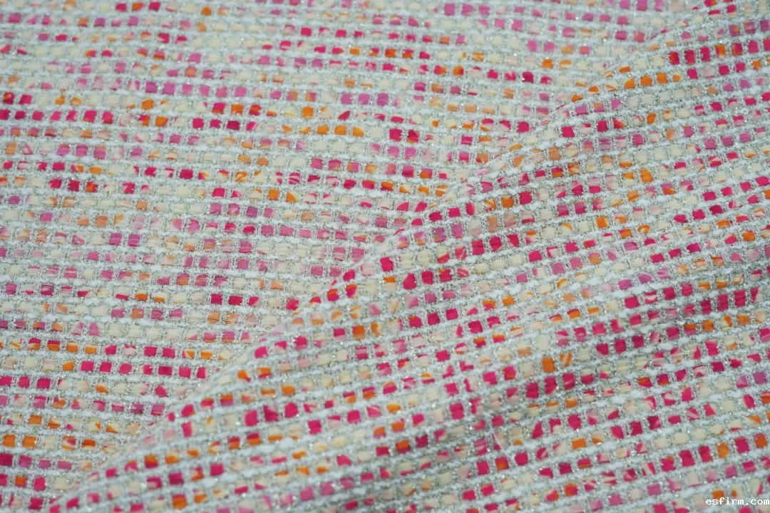 点评:采用涤纶、棉、锦纶为原料的多种花式纱,将强捻雪纺布通过3D数码印花技术、超声波热切烫边技术做成花纹布纱,搭配金银丝,呈现独特的圈圈纹理和凹凸肌理,带来丰富的色彩层次和装饰闪烁的外观风格;环保短流程后整理技术赋予面料绿色属性,整体无弹性但兼具优良的亲肤性与舒适度,适用于外套、裙装等。