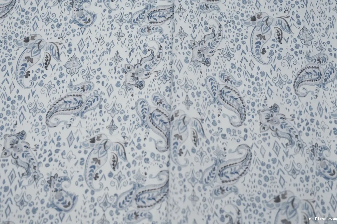 点评:采用棉与天丝混纺50S纱线,通过喷气织机的高速织造技术,斜纹组织结构设计,布面细腻、纹理清晰,既保留棉的吸湿透气性,又融入天丝的光泽与滑爽感;通过数码印花技术呈现经典佩斯利纹样风格与几何元素的巧妙融合,为面料增添趣味细节与层次感;液氨和潮交联的后整工艺使布面光泽柔和、手感顺滑、抗皱,同时也提升了印花的色牢度;机械弹整理赋予面料良好的自然弹性与舒适度,产品兼具美观与实用,适用于衬衫、连衣裙等。