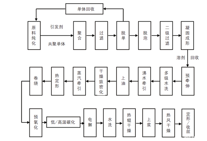 在引发剂的作用下,丙烯腈与共聚单体反应生成碳纤维前驱体(又称“碳纤维原丝”),其中聚合液生产分为一步法和两步法,原丝生产又分为湿纺法和干喷湿纺法。随着碳纤维生产进一步向规模化、低成本化发展,其原丝规格也从小丝束向大丝束、巨丝束转变。此外,生物基原料日益受到研究者关注。
