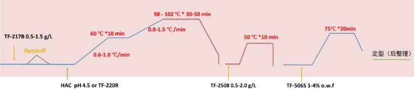 ①染色均匀性:高效匀染剂双组分同步控制(缓染-移染协同);pH滑移技术调节上染速率;三段式温控(分段升温+保温缓染)