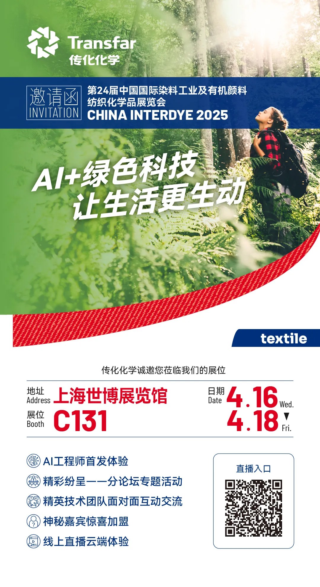 4月16—18日,传化纺织化学诚邀您莅临第24届中国国际染料工业及有机颜料、纺织化学品展览会。