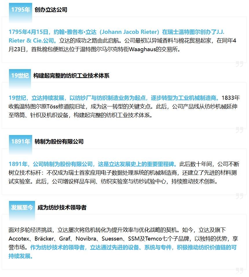 230年来,立达始终代表着纺纱技术领域的开拓创新。1795年,立达诞生,从一家贸易公司起步,成长为全球纺纱技术的领导者。通过专注于自动化、数字化及可持续发展,立达持续引领纱线生产的未来,不断树立行业新标杆。
