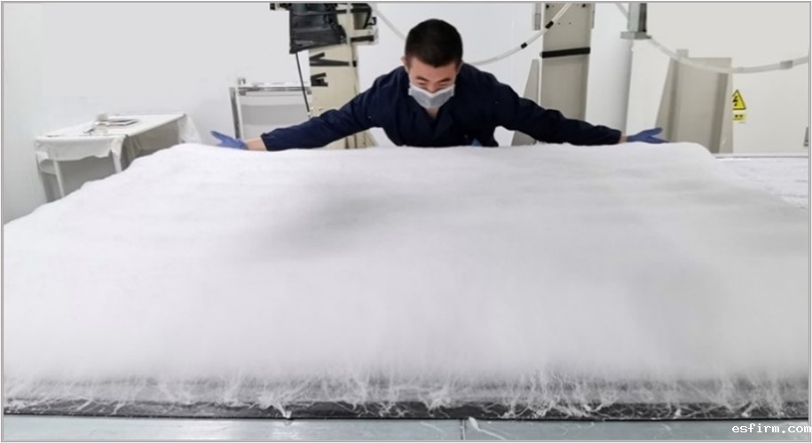 项目团队通过4项关键技术创新,成功解决了当前陶瓷超细纤维难以宏量化生产、无法直接加工成絮片材料等应用难题。首先,项目团队建立了低弧度液面的高效纺丝理论体系,发明了基于宽内径喷口的多射流纺丝技术,大幅提升了单喷口射流数量,实现了超细纤维的高速宏量制备;其次,开发了低分子量、低含量聚合物的聚合物/无机胶粒纺丝液配方,在保证高固含量的同时显著提升了无机组分含量,实现了高无机组分杂化纤维的高效转化;发明了高无机成分超细纤维材料的产业化一步成型工艺,实现了三维网状结构蓬松纤维絮片的规模化生产;研发了柔/弹陶瓷超细纤维絮片的快速煅烧成型技术,创制出具有优异柔性、超弹特性的陶瓷纤维絮片,解决了陶瓷纤维材料脆性大、易断裂的难题。