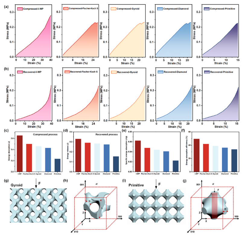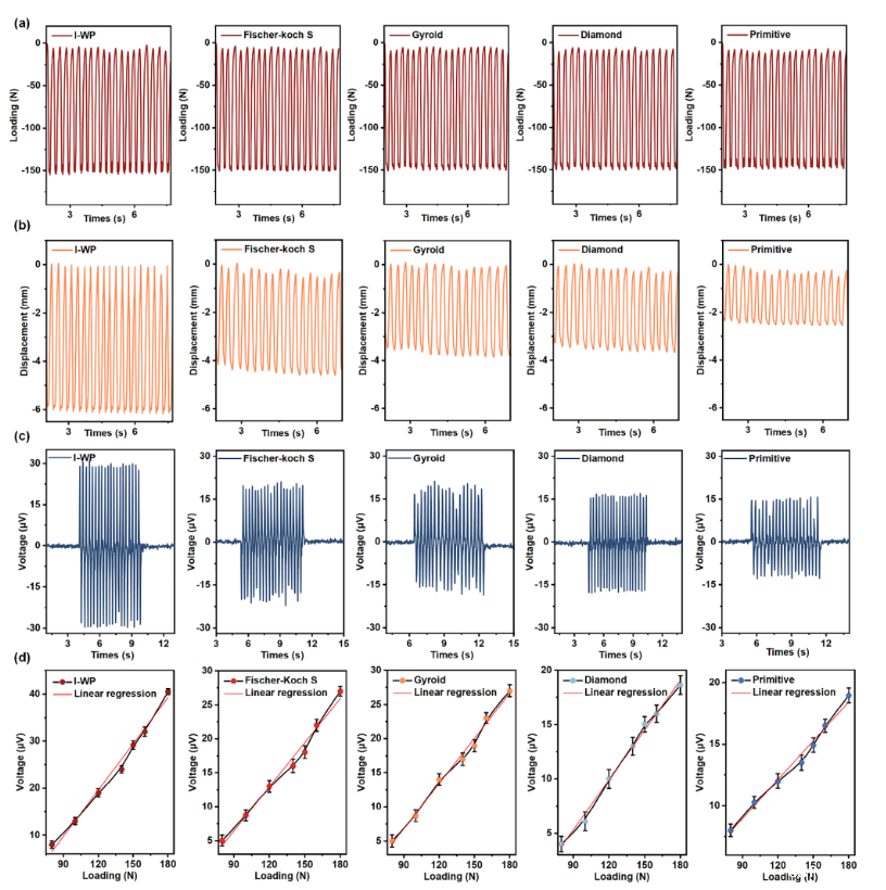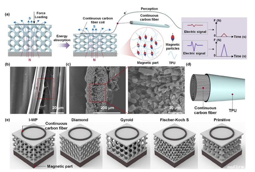 CCF在大多数情况下作为结构承载的部件,关于其功能化的研究较少。因此,研究团队通过材料与结构设计实现了CCF复合材料的功能化与智能化,进一步丰富了CCF的应用场景。基于CCF本身优良的导电性,结合三周期极小曲面多孔结构的设计,所制备的CCF复合材料能够实现对于动态载荷的感知与能量的吸收。