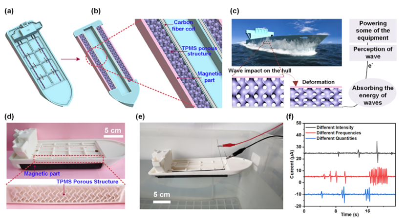 研究团队将连续碳纤维磁电功能复合材料的设计思路进一步与船体的制备相结合。当遭受波浪撞击时,船体中设计的结构可以实时地将波浪中的能量转化为电能,从而为部分设备提供清洁可再生的能源。与此同时,可以根据电信号的特征实时监测波浪的频率与强度,达到监测海面的目的。如果将此方案应用到无人船,还可以不断地从目标海域实时传回信号,而且不用担心船只能源不足的问题。值得一提的是,设计的结构在满足船身基本的强度要求以外,多孔结构的设计还可以适当减轻船体的重量,以及达到对低频无规律特征波浪的缓冲效果,从而为船体的安全提供更多的保障。