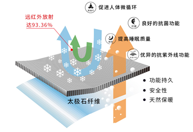 我国对远红外纤维的研究开始于20世纪90年代初,目前已经发展成熟。江苏仲元集团有限公司和南良集团联合研发了远红外热感纤维——温多丝(WINTERSUN),目前已向市场推广。太极石股份有限公司开发的太极石健康能量纤维也具有优异的远红外线发射功能,其通过将天然矽晶石英矿石的纳米粉末加入到聚酯纤维、再生纤维素纤维、锦纶等基体中制备而成,相关测试结果表明,其制成的产品具有远红外、抗菌、防紫外线等多种功能。