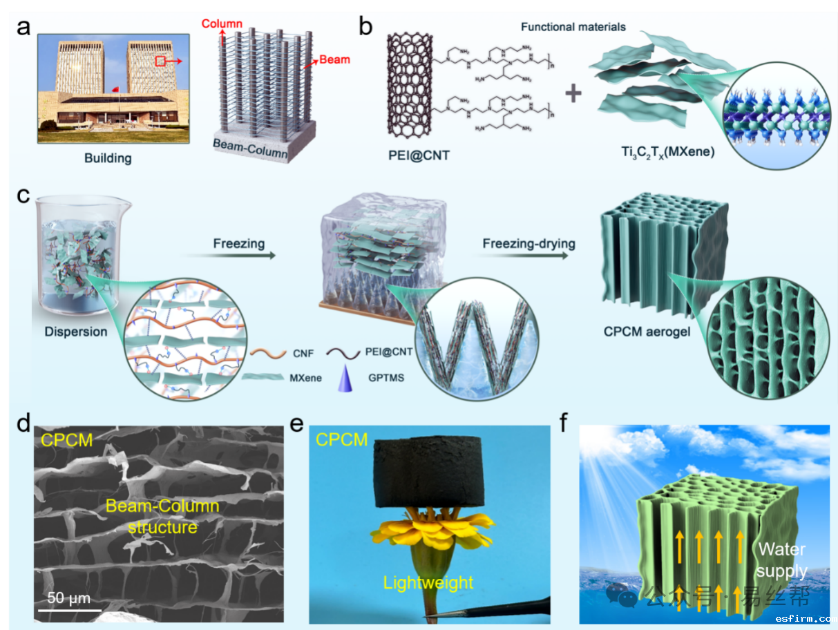 近日,青岛大学张苑苑副教授、姜伟教授团队和东华大学闫建华教授受“梁-柱”承重启发设计,通过定向冷冻方法,利用纳米纤维素(CNF)骨架、胺基功能化的碳纳米管(PEI@CNT)和MXene之间的物理和化学缠结,制备出了具有类似“梁-柱”结构的纤维素纳米纤维基复合气凝胶(CPCM),该结构集成了互锁纤维的多孔结构和光热转换功能成分,具有良好的机械性能和高效的光热转换效率。该研究为开发可长期稳定运行的高效环保型纤维素纳米纤维气凝胶海水淡化蒸发器提供了新思路,相关成果以“Beam-Column Structure Inspired Cellulose-Nanofiber-Based Composite Aerogel for Efficient Solar Desalination and Wastewater Purification”为题,发表在期刊《Chemical Engineering Journal》上。