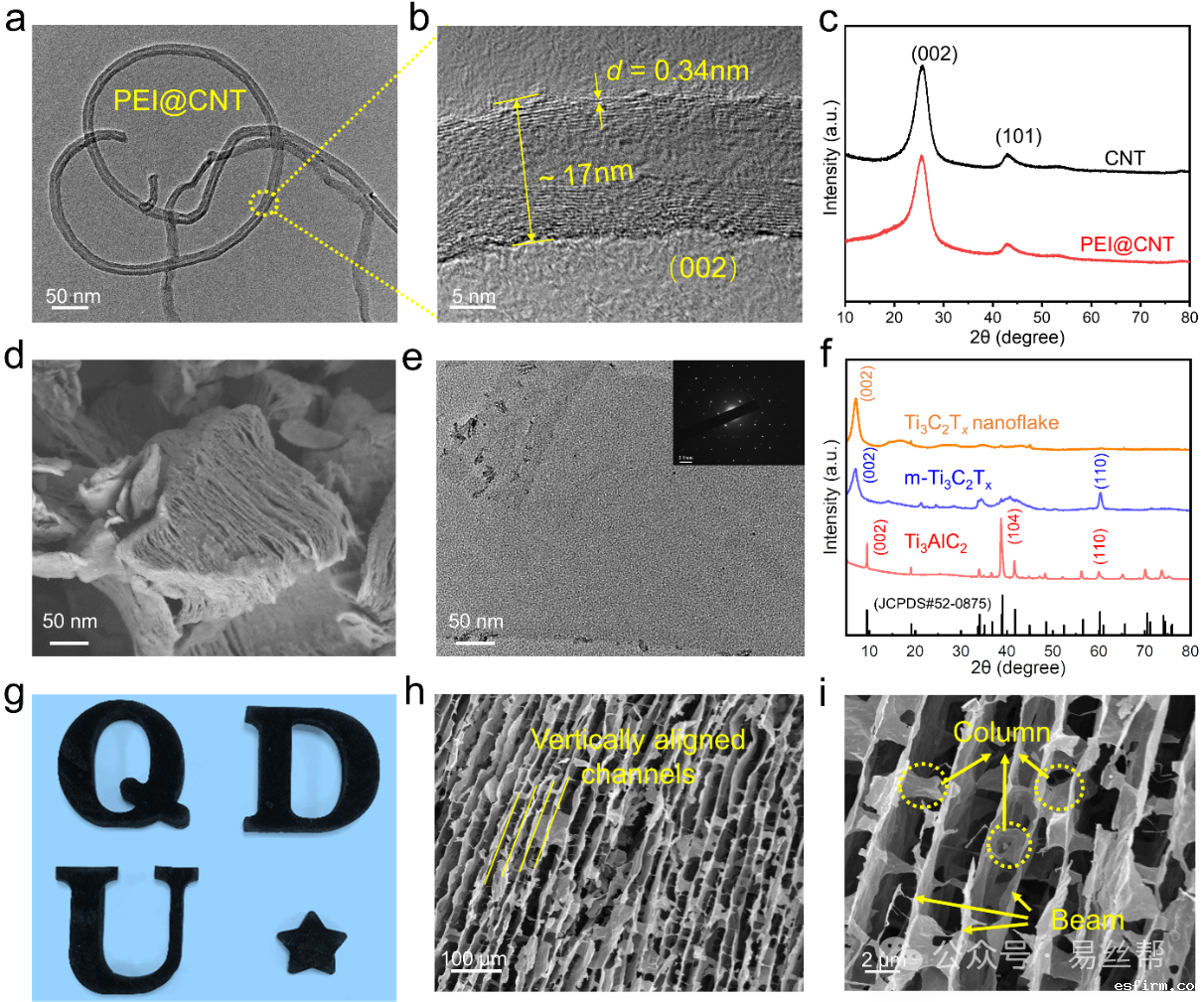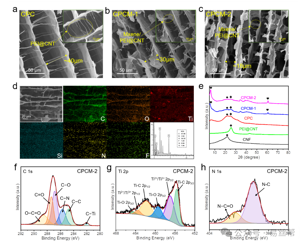 依靠定向冷冻技术,通过交联反应和强氢键作用成功构筑了由纤维素纳米纤维、胺基功能化的碳纳米管和MXene纳米片组成的多孔且有序的3D气凝胶结构。大量的CNF连续排列组成一系列片层结构,这些片层在复合气凝胶中充当“梁”的角色。此外,PEI@CNT和MXene与部分CNF束构成支撑层与层的“柱”结构。这些“柱”强化了片层之间的连接,为气凝胶构筑了一种连续的、有序的“梁-柱”框架结构,也为复合气凝胶的整体稳定性和特有的孔隙结构提供了关键性支撑。