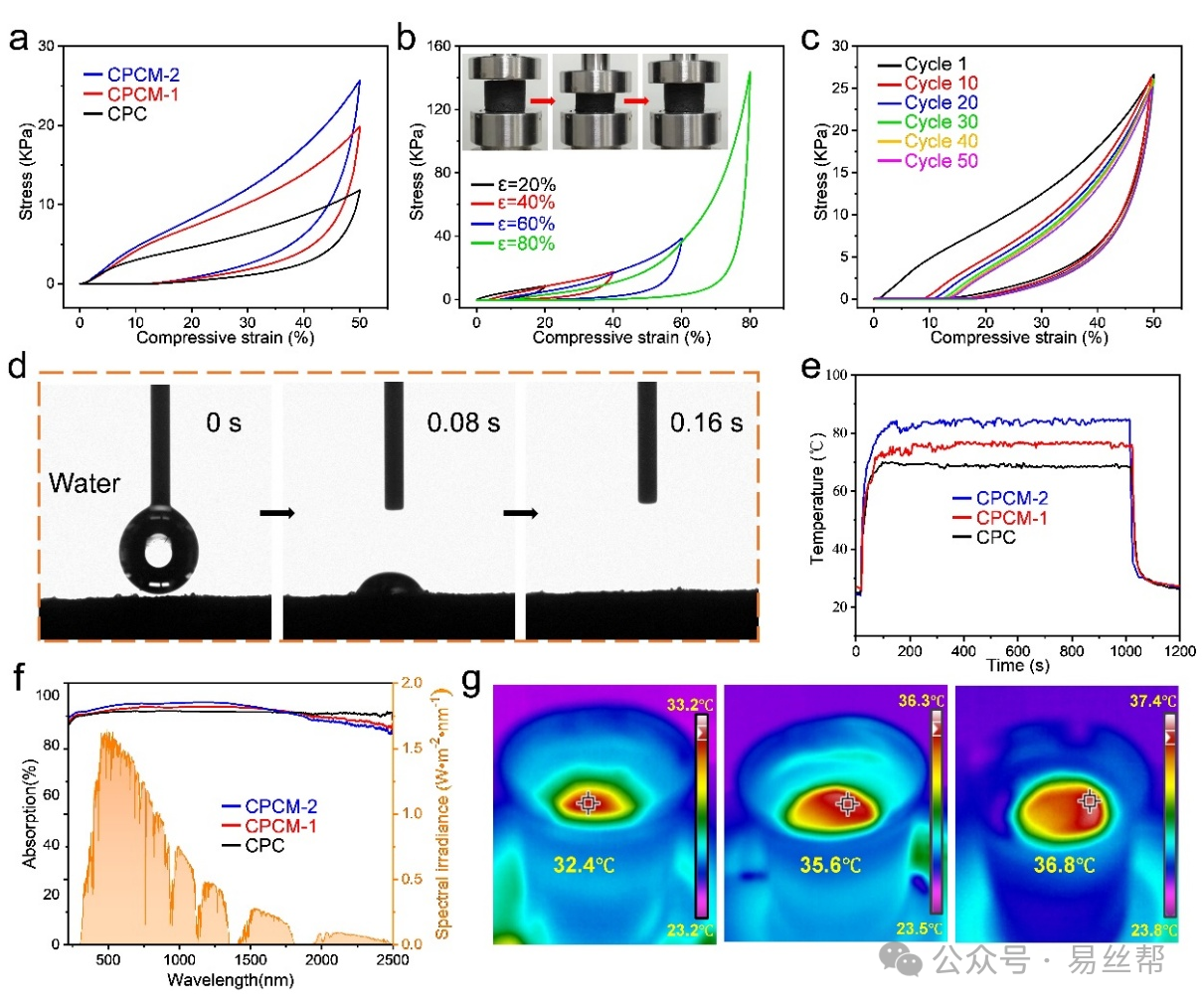 得益于独特的“梁-柱”结构,CPCM气凝胶展现出更优的压缩性能。如图4所示,CPCM-2在50%的应变下表现出最大的压应力,高于没有经过改性和复合的纤维素纳米纤维气凝胶。此外,在80%的应变条件下进行大压缩,CPCM-2气凝胶的最大应力达到143.7 kPa,可以快速恢复到初始状态,变形最小,表明其具有优异的压缩弹性恢复能力和微观结构的稳定性。此外,CPCM气凝胶在1个太阳光密度照射下快速产生温度响应,将太阳能有效地转化为热能,有利于太阳能蒸汽的产生。