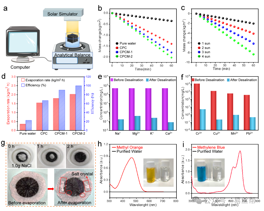 制备的CPCM气凝胶在太阳辐射下保持稳定且高效的蒸发效率,经历了多次重复使用后,CPCM的蒸发速率仍保持在较高水平,证明其具有长期稳定性,展示了CPCM气凝胶可持续生产淡水的潜力。此外,CPCM气凝胶具备优异的拒盐性能和盐分自溶解性能。同时,CPCM气凝胶的离子截留率均在99%以上,远低于世界卫生组织(WHO)对饮用水的规范标准,也可以实现染料废水净化,在水处理领域展现出巨大的应用潜力。