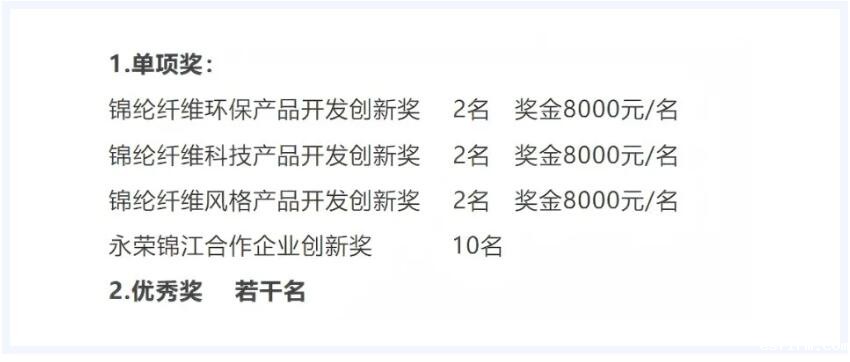 本届大赛组委会与福建永荣锦江股份有限公司联合设置“2025中国国际面料设计大赛——锦纶(永荣锦江)产品开发应用奖”,以鼓励对锦纶产品开发有突出贡献的纺织企业,现将相关活动通知如下: