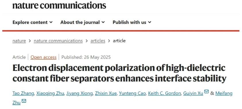 相关成果以“Electron displacement polarization of high-dielectric constant fiber separators enhances interface stability”为题发表在Nature Communications期刊上。