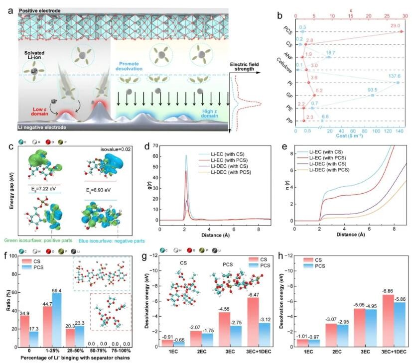 近日,东华大学朱美芳院士/徐桂银教授团队提出了一种由磷酸化纤维素组成的高介电常数纤维隔膜。引入介电常数作为描述符,探讨了具有不同介电常数的纤维隔膜在电场下的响应行为,研究了在均匀内电场前提下,高介电常数隔膜对碱金属电池负极表面的影响。在内部电场下,高介电常数隔膜内的强烈电子位移极化增强了电荷转移动力学并优化了溶剂化结构,这也诱导形成了富含LiF和低聚物的固体电解质界面。此外,高介电常数隔膜可调节电场密度分布并减轻金属电极中的尖端效应。高介电常数隔膜的应用,使得碱金属电池表现出优异的电化学性能和循环稳定性。该工作主要采用湿法成型工艺,并使用生物材料作为原材料,可以实现高介电常数纤维隔膜的大规模生产。