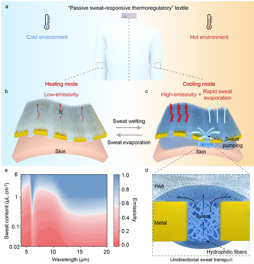 在气候变化加剧和能源危机日益严峻的背景下,开发能够维持人体热舒适性的织物具有重要意义。目前很多研究设计织物来实现人体的降温/加热,然而传统的织物由于无法动态响应环境变化,不仅存在安全风险,还会显著增加空调能耗。因此,科研人员致力于开发新型热调节织物,热调节织物主要分为两类:主动式热调节织物依赖于能源的输入,而被动式热调节织物的热舒适区间有限。值得注意的是,汗液作为天然的温控信号,为开发新型智能织物提供了新思路。然而,如何在不影响穿着舒适性的前提下,实现红外辐射和汗液蒸发的调控,仍是该领域待突破的难题。