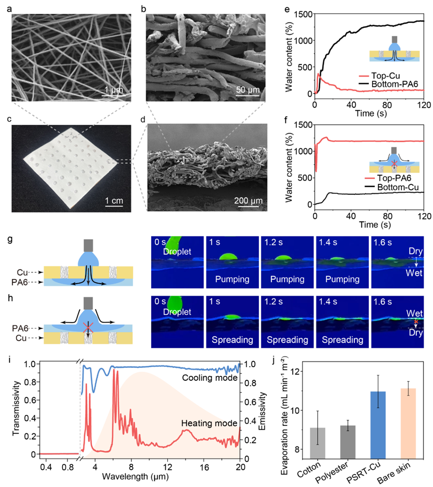 PSRT织物能够实现汗液从Cu层(皮肤侧)到PA6层的快速单向传输,从而实现发射率由0.233到0.955的快速切换。此外,PSRT织物的汗液蒸发速率相较于商用棉实现20%的提升,且达到接近裸露皮肤的效果。优异的光谱性能和蒸发速率为实现良好的降温和加热性能提供保障。