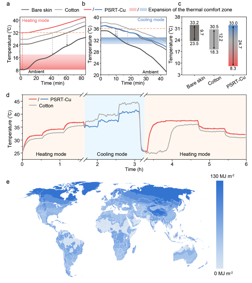 在环境温度变化的场景中,PSRT织物能够实现24.7 ℃的热舒适区间(8.3~33 ℃),相较于裸露皮肤和棉织物分别扩展了15 ℃和12.5 ℃。而在运动状态变化的场景中,产生汗液时该织物比棉织物低2.2~3.4℃。根据全球17个气候区建筑能耗模拟显示,该织物相较于棉织物可节省29.9~125.1 MJ·m-2能量,为应对气候变化下的节能穿戴提供了革新性解决方案。