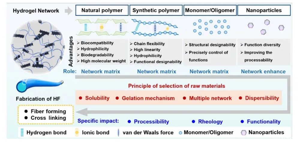 作者详细讨论了水凝胶纤维的常见材料,包括天然聚合物(如海藻酸钠、壳聚糖、纤维素等)、合成聚合物(如聚乙烯醇、聚N-异丙基丙烯酰胺等)、单体/寡聚物以及纳米颗粒。这些材料的选择对水凝胶纤维的性能和功能有重要影响。