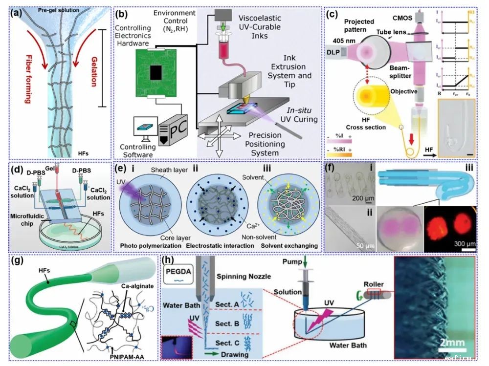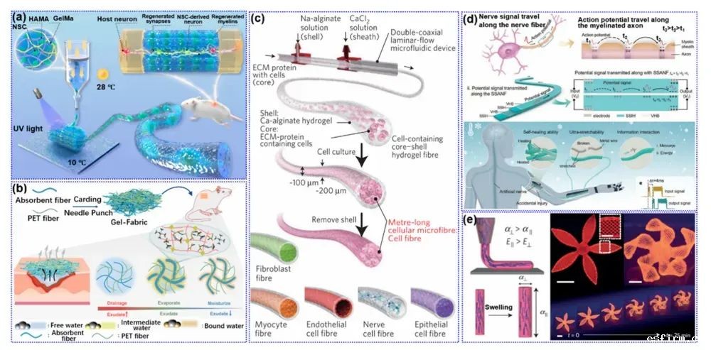 作者讨论了水凝胶纤维的多种制备技术,包括湿法纺丝、微流体纺丝、动态聚合纺丝、3D打印等。这些技术各有优缺点,适用于不同的应用场景。