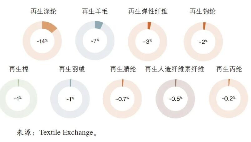 根据这份报告,再生纤维(包括再生化纤和再生天然纤维)所有品类合计产量的占比略有下降,从2021年的8.5%左右降至2022年的7.9%,下降原因包括PET瓶的供给压力进一步加大;纺织品-纺织品回收的规模化遭遇系统性挑战;原生合成纤维的产量增长,对再生纤维的价格造成冲击。
