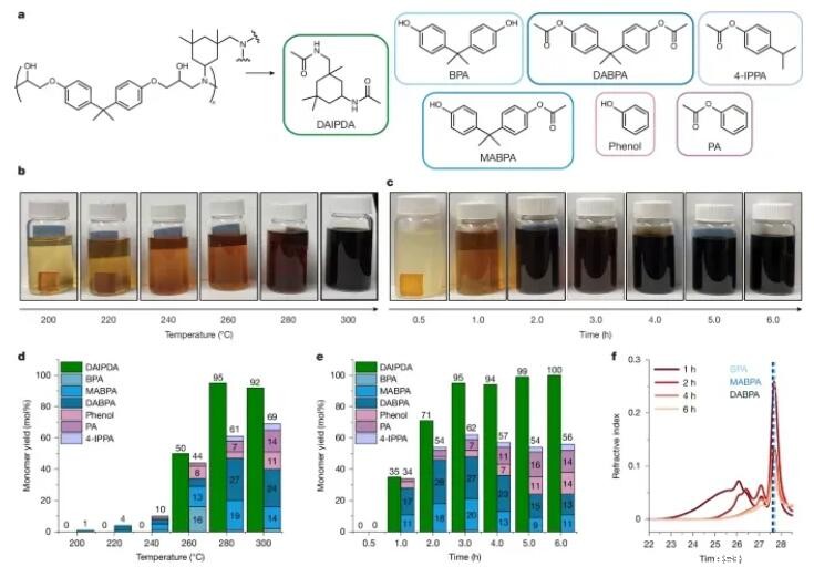 作者首先对由环氧胺树脂组成的典型热固性体系进行乙酰解。选取由BADGE(双酚A二缩水甘油醚)和IPDA(异佛尔酮二胺)形成的脂肪族环氧树脂作为代表性体系。反应条件为:280°C,30bar氮气保护,冰醋酸气氛。在压力反应器中,针对20mL溶剂中250mg大小的固化树脂小块(1×1×0.2cm)进行了优化。图1a概述了乙酰解构机理:醚键和胺键断裂,释放出BPA、DAIPDA、MABPA、DABPA、苯酚、苯乙酸酯(PA)和4-异丙基苯乙酸酯(4-IPPA)等产物。温度筛选结果表明,随着温度升高,单体产量迅速增加。图 1d 表明,BPA 的产率在 280~300°C 时达到峰值,约为 99mol%,而 DAIPDA(IPDA 的乙酰化形式)在 280°C 时达到 100mol%。时间过程分析(图 1e)表明,BPA 衍生物的产率在 3 h内达到最大值,但随着进一步加热而下降,这可能是由于热降解所致。然而,DAIPDA 的产率稳步上升,并在 4 h后实现定量回收。GPC(凝胶渗透色谱)分析(图 1f)证实了可溶性低聚物的消失以及 BPA 衍生单体的增加,从而证实了有效的解聚。作者证明了脂肪族环氧热固性材料的完全化学解构是可行的,并且在相对温和且可扩展的条件下可以实现选择性和可量化的单体回收。