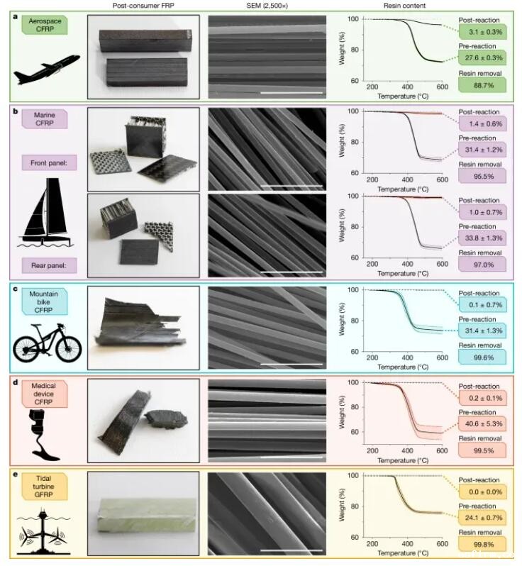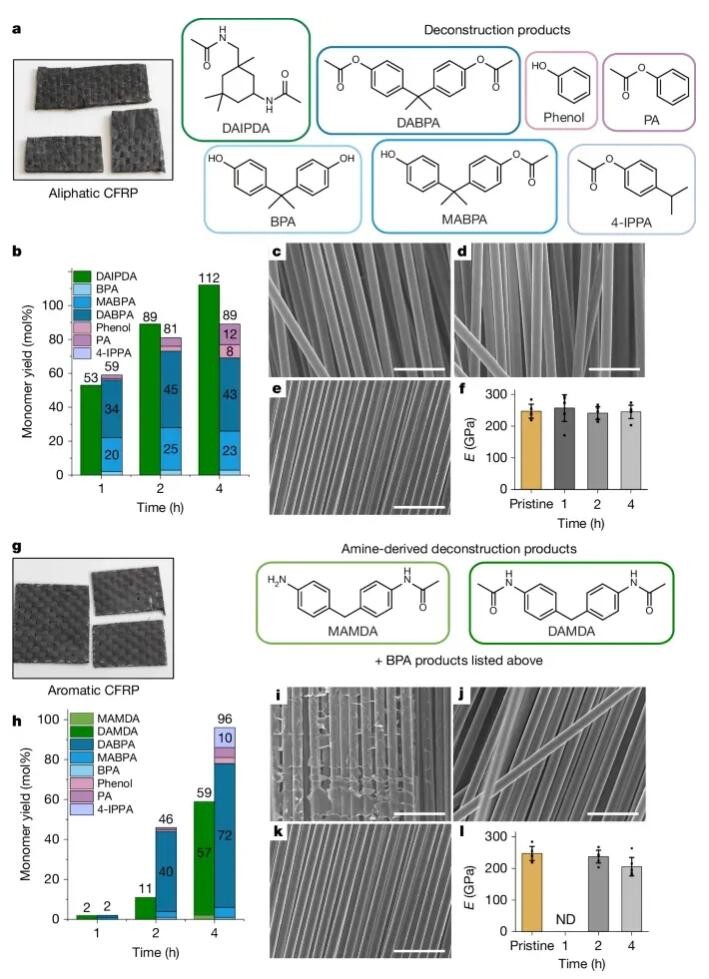 鉴于此,美国可再生能源实验室GreggBeckham教授研究结果显示,乙酸可以有效地将CFRP中使用的脂肪族和芳香族环氧胺热固性材料解聚为可回收单体,从而得到纯净的碳纤维。对来自多个行业的材料的解构证明了这种方法的广泛适用性,只需2h的反应即可得到清洁纤维,这些碳纤维被再回收两次,始终保持其强度。工艺建模和技术经济分析(以风力涡轮机叶片废料产生量为参考)表明,该方法具有成本效益,再生碳纤维的最低售价为每公斤1.50美元,而生命周期评估显示,该工艺的温室气体排放量比原生碳纤维生产低约99%。总体而言,该方法可以实现工业碳纤维增强塑料的回收利用。相关研究成果以“Acetolysis for epoxy-amine carbon fibre-reinforced polymer recycling”为题发表在最新一期《nature》上。