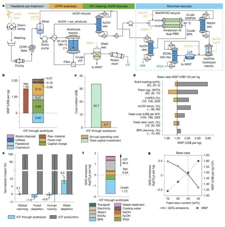 作者展示了一个简化的工艺流程图(图 4a):CFRP 输入材料经过切碎、溶解、纤维分离以及溶剂蒸馏再利用。单体分离涉及酸碱中和和填料床反应器 (PBR)。 图 4b-c 给出了年产 10000 t(30 t/天)设施的经济数据: 资本支出 (CAPEX):3370 万美元;年运营成本:470 万美元; rCF 最低售价 (MSP):1.50 美元/公斤;副产品抵免(单体):0.60 美元/公斤。图 4d 包含单变量敏感性分析,显示 MSP 值根据树脂含量、原料成本和 BPA 分解情况在 1.30 美元/公斤至 1.65 美元/公斤之间变化。作者比较了生命周期评价 (LCA) 类别(图 4e),结果显示全球变暖量、化石燃料枯竭、水资源消耗和人体毒性均减少了 90% 以上。图 4f-g 显示,即使树脂含量较高,温室气体排放量和最低可回收利用率 (MSP) 仍然保持在较低水平。这证明了该工艺的可行性和卓越的环保性能。