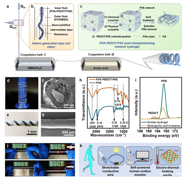 近期,北京服装学院吴汉光教授与北京化工大学田明教授合作,在Advanced Fiber Materials发表了题为“Strain-Insensitive Stretchable Conductive Fiber based on Helical Core with Double-Network Hydrogel”的研究成果。该研究采用微流控纺丝技术,将具有半互穿网络结构的螺旋形导电聚合物水凝胶芯层引入到全聚合物纤维中,实现了全聚合物可拉伸导电纤维的连续稳定制备,并通过优化工艺参数,提升了材料结构与性能的协同性。所制备的纤维具有500%的断裂伸长率和147 S/cm的体积电导率,在100%应变下电阻变化率仅为5%,在2000次循环拉伸后依然保持良好的性能稳定性。凭借其良好的导电性及抗拉伸干扰性能,该导电水凝胶纤维在可拉伸导线、自供电传感器和电热加热器等智能穿戴领域展现出广阔的应用前景。